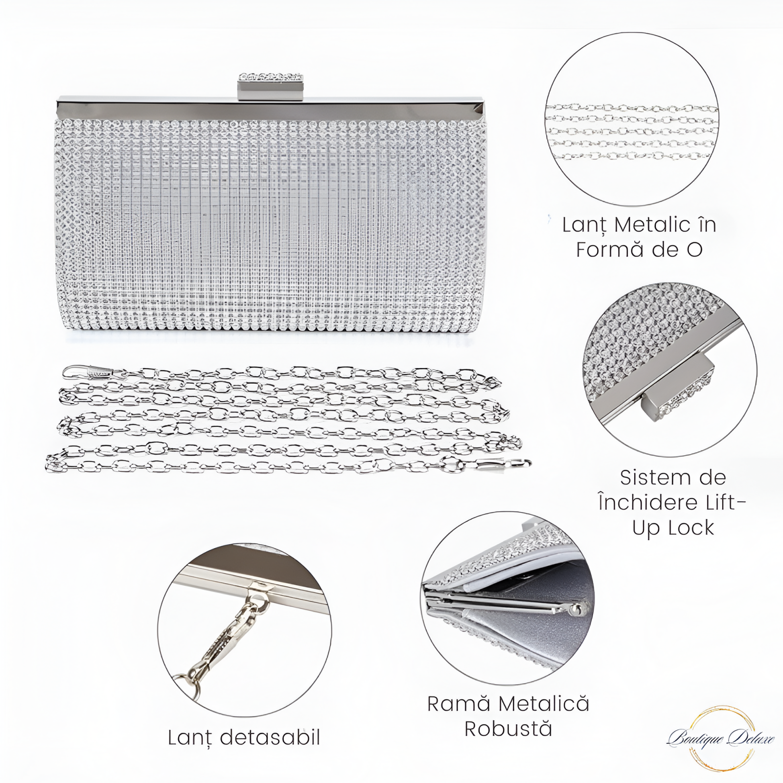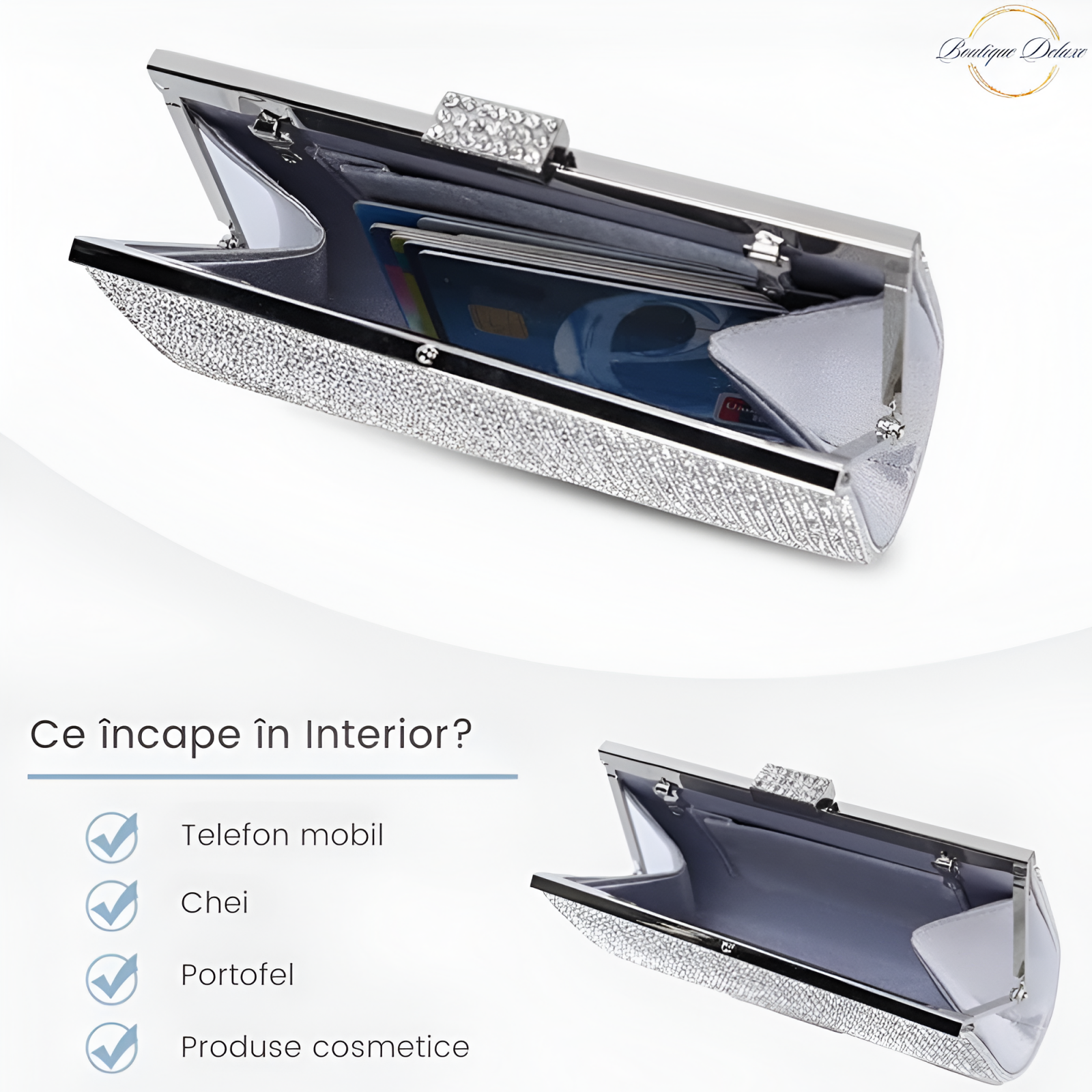 Forma sa originala de clutch, acoperita cu cristale mici argintii, stralucitoare o fac sa fie foarte trendy.