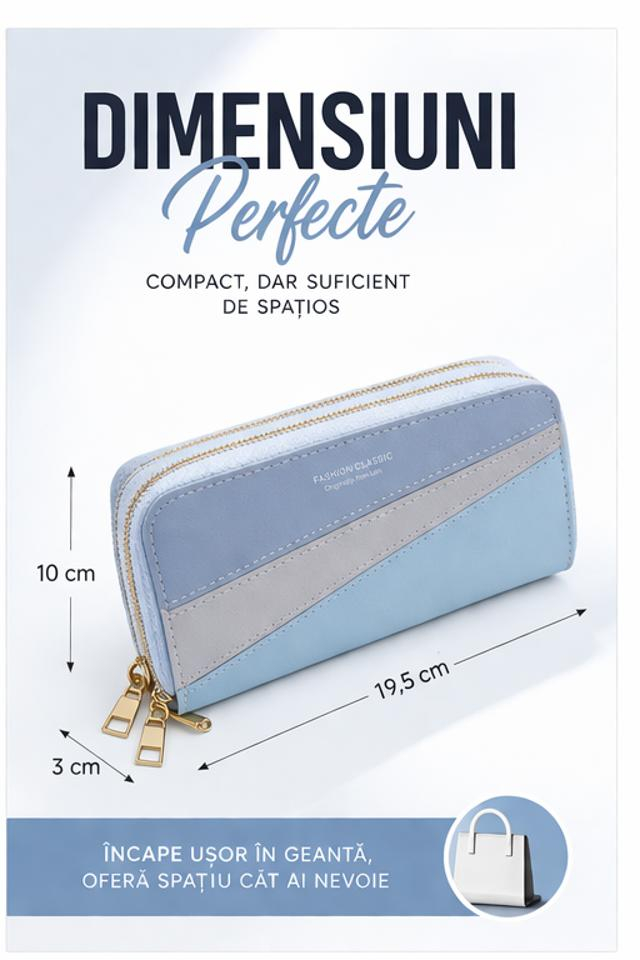 Realizat din piele ecologică rezistentă, portofelul are un design modern, în culori pastelate de albastru și gri, ușor de asortat cu orice outfit. Sistemul de închidere cu fermoar dublu oferă siguranță sporită, iar breteaua detașabilă îți permite să îl porți comod în mână, ca un mini-clutch.