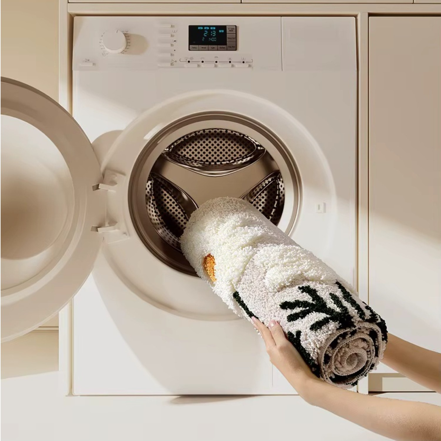 Covorasul de baie cu design de flori margarete este solutia ideala pentru a adauga o nota de prospetime si confort in orice decor. Este perfect pentru a transforma baia intr-un spatiu placut si primitor, ideal pentru momentele de relaxare.